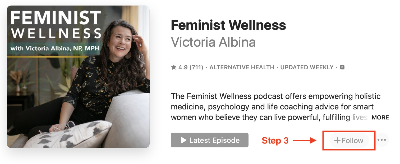 To subscribe (now called "follow" the show) on Apple Podcasts, visit the Feminist Wellness podcast page and click on the purple "Listen on Apple Podcasts" button and then “Open Podcasts” button. This will launch Apple Podcasts on your computer and bring up the podcast.