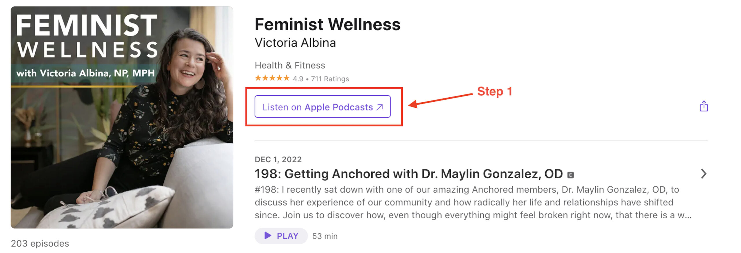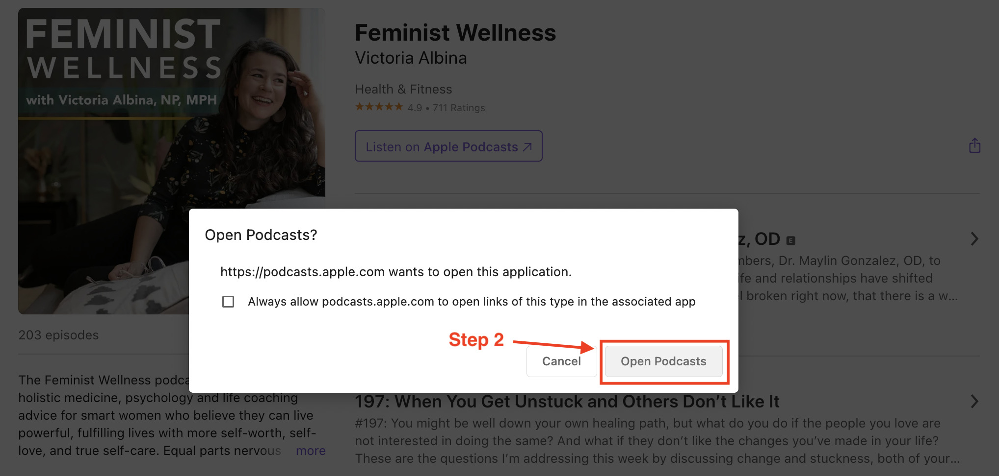 - Click the purple button that says ‘Follow, Rate & Review the Podcast’. This should bring up a pop-up with another purple button, click that purple button as well, this will take you to the Feminist Wellness podcast page in Apple Podcasts