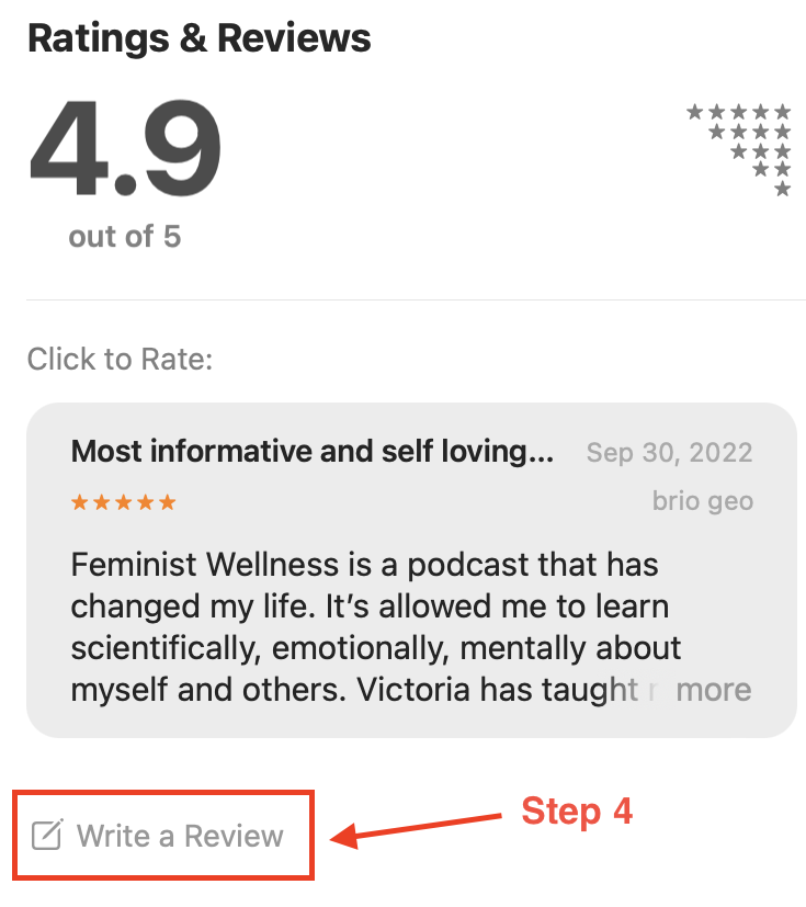 How to Review: Once you’ve listened to an episode or two, scroll to the bottom of the Feminist Wellness podcast page in Apple Podcasts to leave a review. Remember the title of your review so you can enter it in the form above!